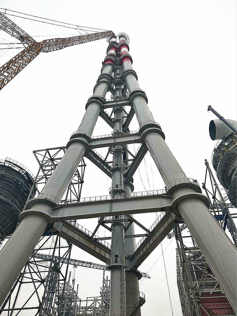 2018年12月25日上午10點10分,山鋼日照精品鋼基地2×350MW自備電廠工程三管自立式鋼煙囪第七層A、B、C筒順利吊裝就位,煙囪主體鋼結(jié)構(gòu)吊裝到頂。這標志著我國第一根180米三管自立式鋼煙囪,也是首根采用內(nèi)壁鈦板貼襯防腐的大型鋼管結(jié)構(gòu)煙囪的落成。